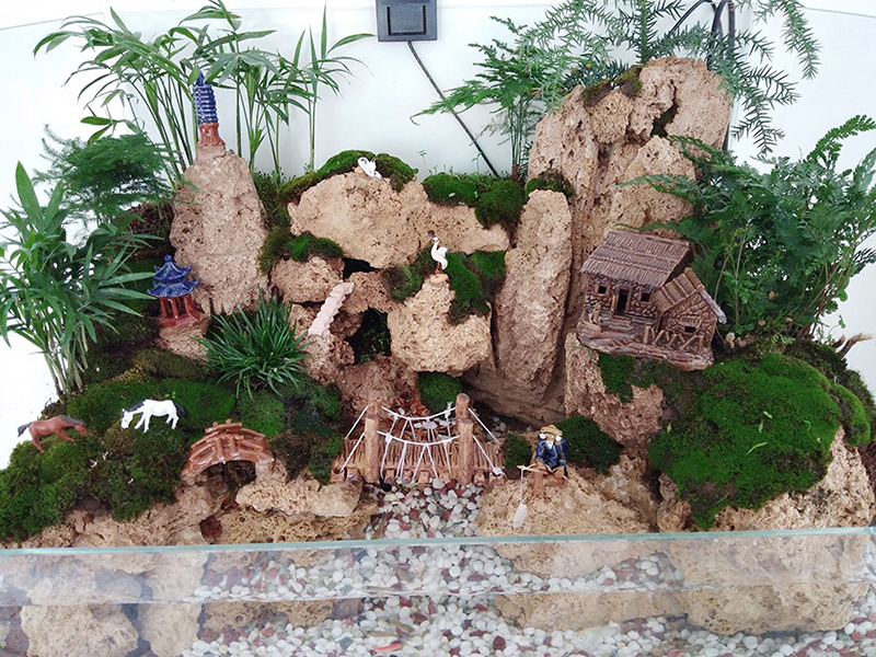 除了丰富的绿植,吸水石“真山”盆景还有许多迷人的“小配饰”。这些小配饰包括古典风格浓郁的小桥、一对姿态优美的仙鹤、孤独而高洁的钓鱼叟、超然而潇洒的对奕老人、雕梁画栋的山间亭子……简直是“浓缩”的一座青山,一瞬间让人感到仿佛穿越时空,回到了古代。如果,在山底水中再养上几尾金鱼,更是多了活泼的情调。当然这些小配饰也并不全是古典风格,一些朴实可爱的小木屋,充满田园气息的木水车,不断转动的、象征“财源滚滚”的大理石水球,尽可以按自己的喜好设置美的吸水石盆景。